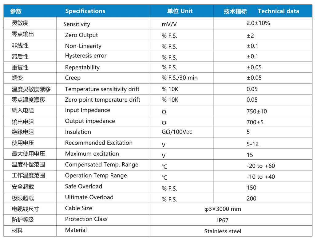输出:1mv/V、0~±5/10V、4~20mA可选
